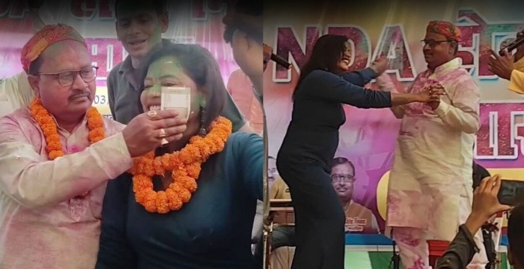 विधायक ने गायिका के साथ मंच पर नाचते हुए 500 रुपये का नोट उन्हें भेंट किया, जिसका वीडियो अब सोशल मीडिया पर वायरल हो रहा है. प्रभात खबर इस वायरल वीडियो की पुष्टि नहीं करता है. विधायक ने सोमवार को लोकप्रिय अंगिका गायक छैला बिहारी में कार्यक्रम में ज्यादा से ज्यादा लोगों को आने का न्योता दिया है.