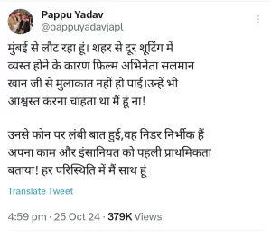 पप्पू यादव ने सलमान खान से की बात कहा- हर परिस्थिति में मैं साथ हूं, आश्वस्त रहिए मैं हूं ना