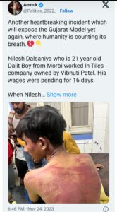 गुजरात:- मोरबी से एक दलित युवक की बेरहमी से पिटाई का मामला सामने आया है। पीड़ित ने पुलिस को शिकायत दे कर बताया कि वो बकाया वेतन मांगने कि लिए कंपनी के मालकिन के घर गया था। यहां सैलेरी मांगने पर कई लोगों ने मिलकर उसकी पिटाई की। उन लोगों की क्रूरता यहीं नहीं रूकी, आरोपियों ने पिटाई के बाद पीड़ित के मुंह में चप्पल डाली और उसे माफी मांगने के लिए मजबूर किया। पीड़ित की शिकायत के आधार पर पुलिस ने आरोपियों के खिलाफ केस दर्ज कर, उनके घर पर दबिश की। हालांकि, पुलिस को वहां पर कोई नहीं मिला। इस मामले में मोरबी के डीएसपी पीए झाला ने बताया कि पीड़ित की शिकायत के आधार पर 6 लोगों के खिलाफ केस दर्ज कर लिया गया है।