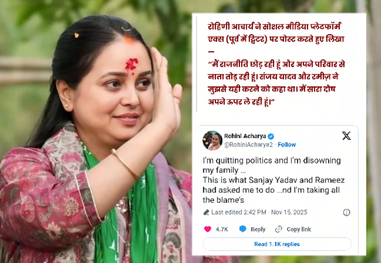 लोकतंत्र सवेरा : बिहार विधानसभा चुनाव में महागठबंधन की करारी हार के बाद लालू प्रसाद यादव के परिवार में मानो राजनीतिक ‘महाभारत’ छिड़ गया है। हार का झटका सिर्फ गठबंधन के नेताओं को नहीं लगा, बल्कि इसका सीधा असर लालू यादव के परिवारिक समीकरणों पर भी दिखाई देने लगा है। इसी बीच बड़ी खबर आई है कि लालू-राबड़ी की बेटी रोहिणी आचार्य ने राजनीति और परिवार दोनों से दूरी बनाने का ऐलान कर दिया है।