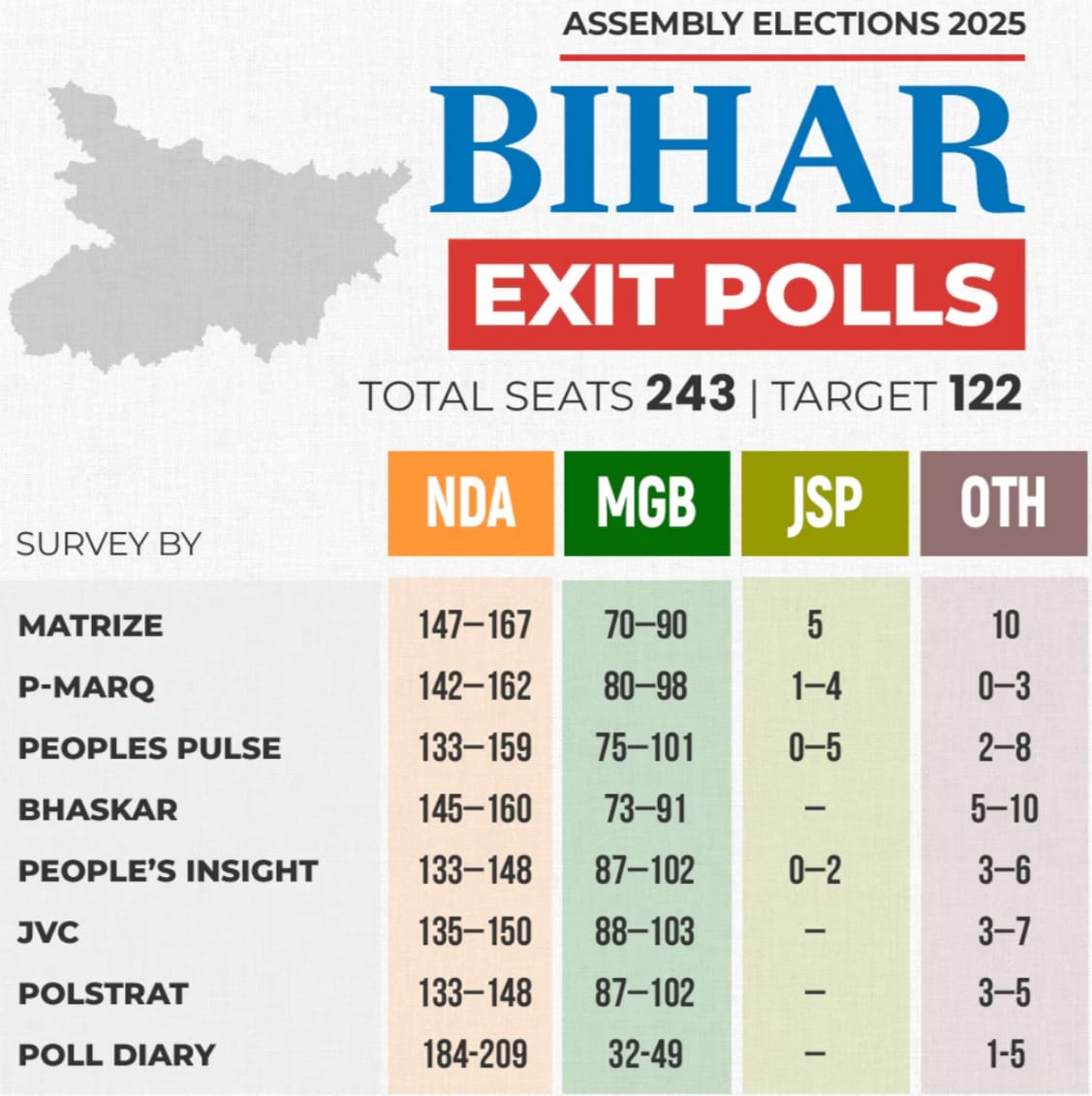 ‘मैट्रिज’ के सर्वेक्षण के अनुसार, राजग 147 से 167 सीटों के साथ दो तिहाई बहुमत का आंकड़ा हासिल कर सकता है. इसके एग्जिट पोल में कहा गया है कि महागठबंधन को 70 से 90 सीटें मिल सकती हैं तथा जन सुराज को शून्य से दो सीट ही मिलने के आसार हैं।