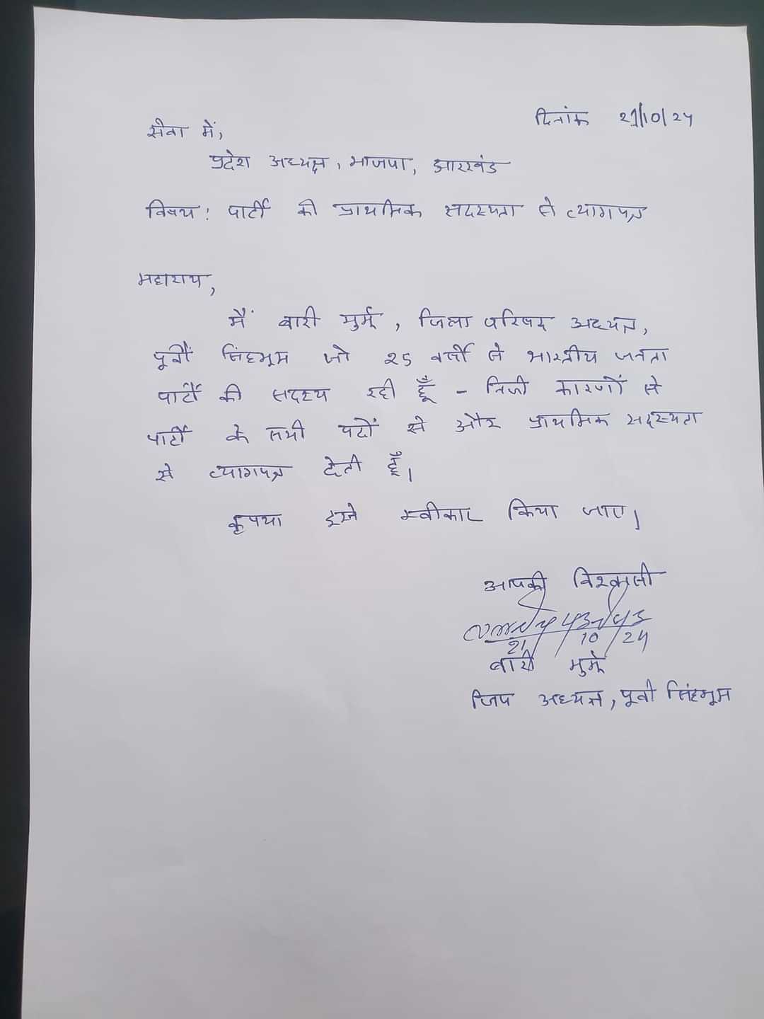 BREAKING : जिला परिषद अध्यक्ष बारी मुर्मू ने दिया पार्टी के सभी पदों से दिया इस्तीफा… कहा
