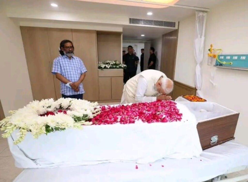जमशेदपुर : झारखंड के पूर्व मुख्यमंत्री और झामुमो के संस्थापक संरक्षक शिबू सोरेन का सोमवार सुबह निधन हो गया है। दिल्ली के गंगाराम अस्पताल में उन्होंने 81 साल की उम्र में आखिरी सांस ली। झारखंड और देश के बड़े आदिवासी नेता के तौर पर पहचाने जाने वाले शिबू सोरेन को सम्मान से दिशोम गुरु भी कहा जाता था। उनके निधन पर देश के प्रधानमंत्री नरेंद्र मोदी और राष्ट्रपति द्रौपदी मुर्मू ने शोक प्रकट किया। शिबू सोरेन किडनी संबंधी समस्याओं के कारण एक महीने से ज्यादा समय से दिल्ली के गंगाराम अस्पताल में इलाज करा रहे थे। पीएम मोदी और राष्ट्रपति मुर्मू ने सर गंगाराम अस्पताल जाकर शिबू सोरेन के अंतिम दर्शन किए और हेमंत सोरेन को ढाढ़स बंधाया। उन्होंने कल्पना सोरेन को भी सांत्वना दी।