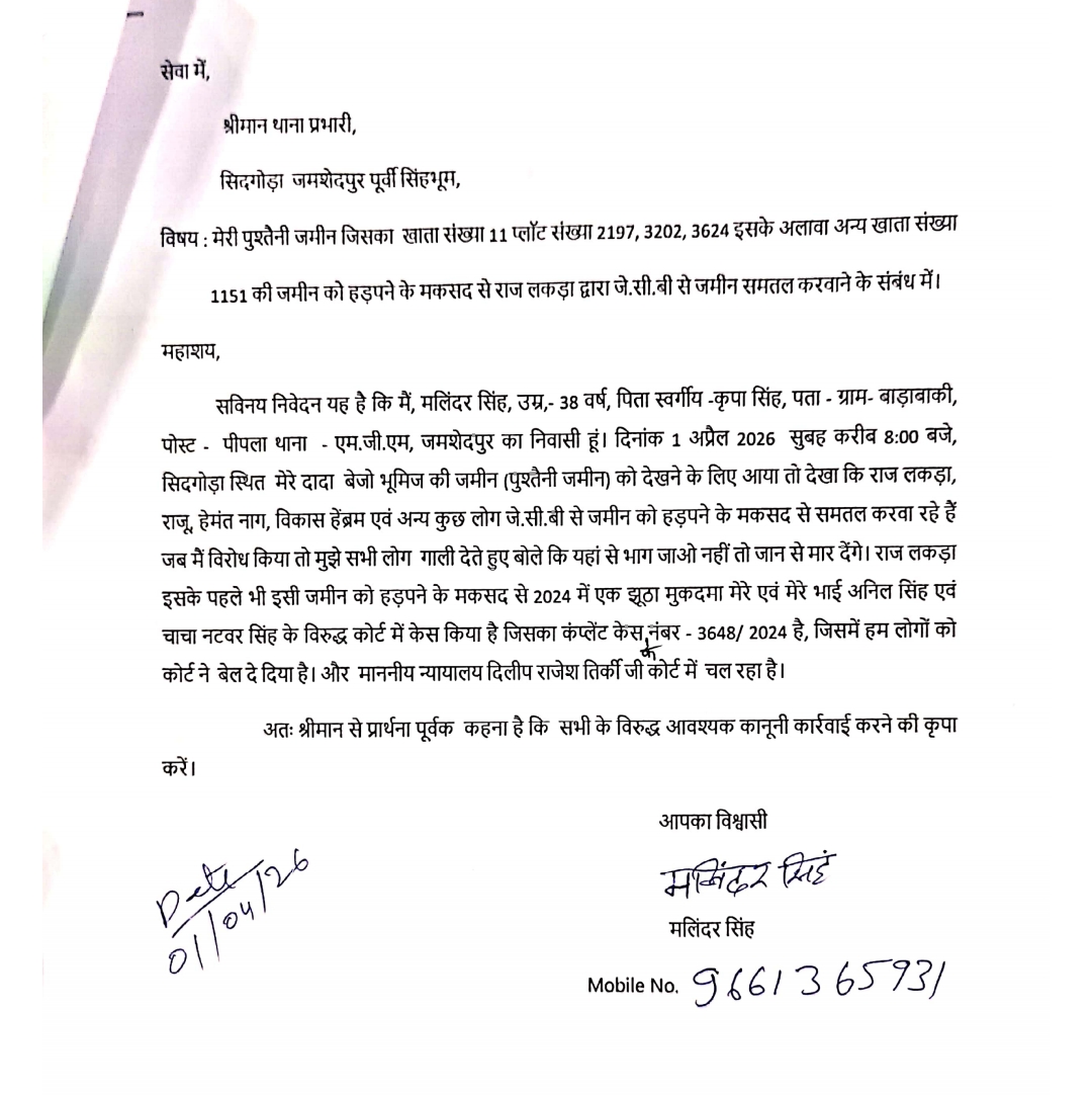 पीड़ित मलिंदर सिंह (38), निवासी बड़ाबांकी, ने थाना प्रभारी को दिए आवेदन में बताया कि 1 अप्रैल 2026 की सुबह करीब 8 बजे जब वह सिदगोड़ा स्थित अपने दादा बेजो भूमिज की पुस्तैनी जमीन देखने पहुंचे, तो वहां राज लकड़ा, राजू हेमंत नाग, विकास हेंब्रम समेत कई लोग जेसीबी से जमीन समतल करवा रहे थे। उनका आरोप है कि यह पूरा काम जमीन पर अवैध कब्जा करने के उद्देश्य से किया जा रहा था।