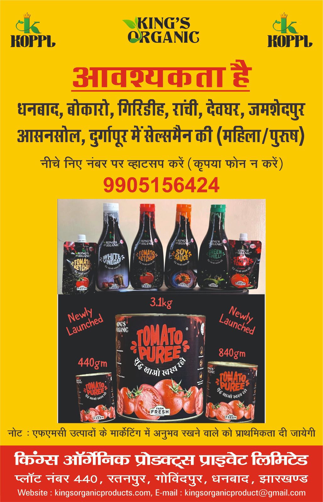 धनबाद : किंग्स ऑर्गेनिक प्रोडक्ट्स प्राइवेट लिमिटेड, प्लॉट नंबर 440, रतनपुर गोविंदपुर धनबाद, झारखंड को धनबाद, बोकारो, गिरिडीह, रांची देवघर जमशेदपुर, आसनसोल, दुर्गापुर में महिला और पुरुष सेल्समैन की आवश्यकता है. इच्छुक प्रतिभागी 9905156424 व्हाट्सप नंबर पर संपर्क कर सकते हैं. एफएमसी उत्पादों के मार्केटिंग में अनुभव रखने वाले को प्राथमिकता दी जाएगी।