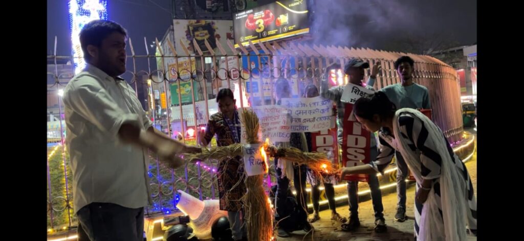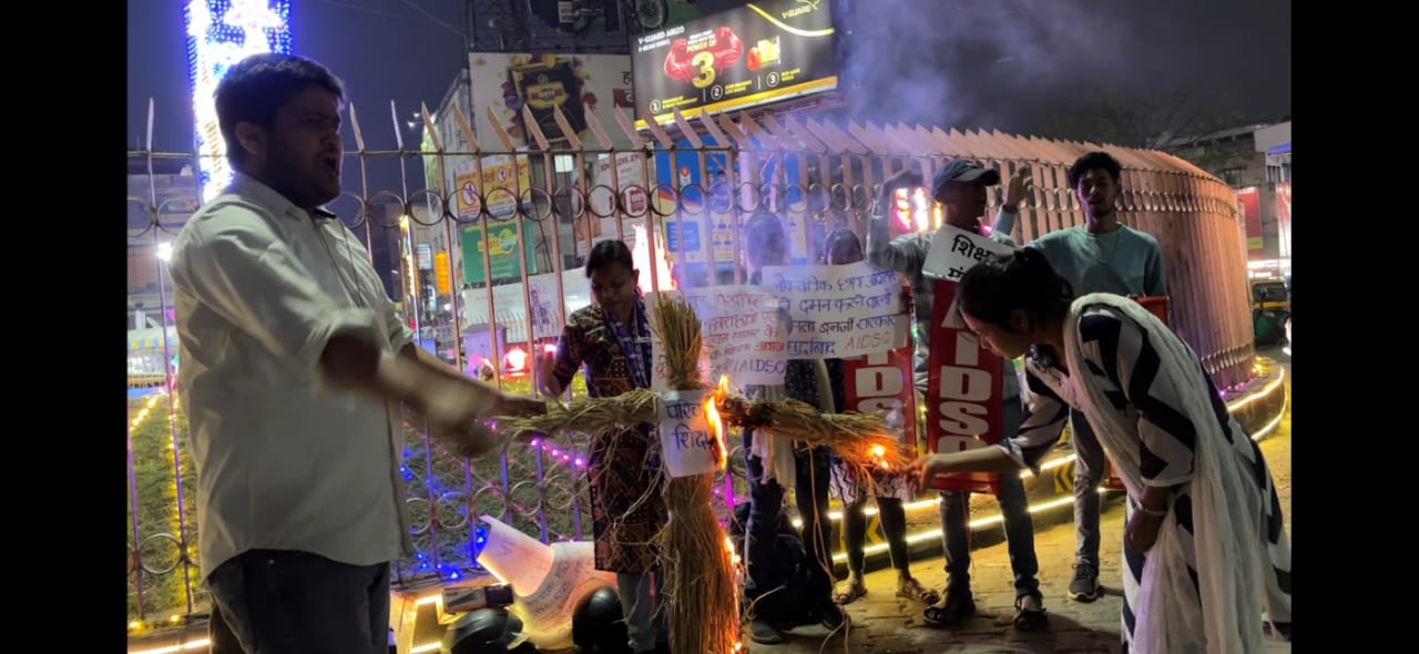 जमशेदपुर : पश्चिम बंगाल के जादवपुर विश्वविद्यालय में छात्र संघ चुनाव कराने और साथ मे विभिन्न शैक्षणिक मुद्दों को लेकर आंदोलनकारी छात्रों के ऊपर शिक्षा मंत्री का काफिला का गाड़ी चढ़ा दिया गया था जिससेे कई छात्र ग़ंभीम रूप से घायल हुए, इस बर्बरता पूर्ण घटना के खिलाफ छात्र संगठन AIDSO पश्चिम बंगाल राज्य कमिटी की और से विगत कल 3 मार्च को राज्यव्यापी विरोध दिवस हड़ताल का आह्वान किया गया था और इस घटना के विरोध मे उतरे आंदोलनकारी छात्रों के साथ तृणमूल छात्र परिषद के छात्र और साथ मे टीएमसी के गुंडावाहिनी व पुलिसी गठजोड़ द्वारा बर्बर हमला किया गया। इसके खिलाफ में व सशक्त छात्र आंदोलन संगठित कर कैंपस में लोकतांत्रिक माहौल को बचाने के लिए 4 मार्च को ऑल इंडिया डेमोक्रेटिक स्टूडेंट्स ऑर्गनाइजेशन (एआईडीएसओ) के केंद्रीय परिषद द्वारा अखिल भारतीय संकल्प दिवस का आह्वान किया गया था। इसी क्रम मे आज साकची गोलचक्कर मे पश्चिम बंगाल मुख्यमंत्री और शिक्षा मंत्री का पुतला दहन के साथ संकल्प दिवस मनाया गया।