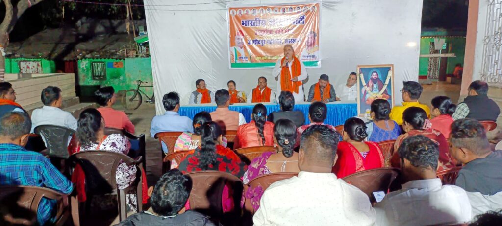 जमशेदपुर : समाज में व्याप्त ऊंच-नीच, भेदभाव को समाप्त कर समानता, प्रेम और भाईचारे का संदेश देने वाले संत शिरोमणि सतगुरु रविदास महाराज की 648वीं जयंती को भाजपा अनुसूचित जाति मोर्चा ने श्रद्धाभाव से मनाई। इस अवसर पर भालूबासा स्थित मुखी बस्ती में एक भव्य कार्यक्रम का आयोजन किया गया। बुधवार को भाजपा अनुसूचित जाति मोर्चा के अध्यक्ष परेश मुखी की अध्यक्षता में आयोजित कार्यक्रम में संत रविदास जी के आदर्शों, उनकी शिक्षा और सामाजिक सुधारों पर विचार-विमर्श किया गया। इस अवसर पर भाजपा जमशेदपुर महानगर के जिलाध्यक्ष सुधांशु ओझा, आईटी सेल सह संयोजक उज्जवल सिंह समेत महिला मोर्चा अध्यक्ष नीलू मछुआ एवं मोर्चा के कई पदाधिकारी एवं गणमान्य लोग मौजूद रहे। इससे पहले, कार्यक्रम की शुरुआत में अतिथियों ने संत रविदास के चित्र पर माल्यार्पण कर नमन किया।