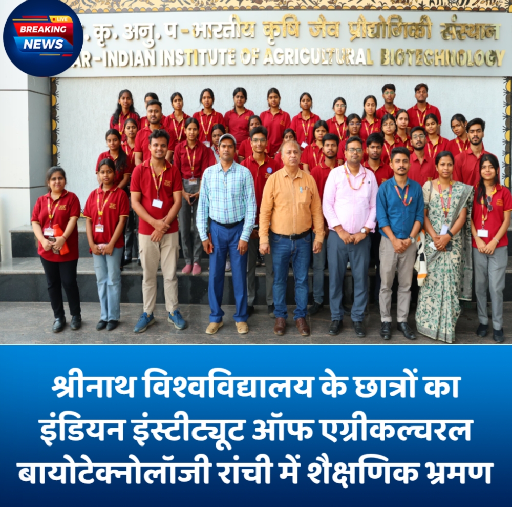 जमशेदपुर। श्रीनाथ विश्वविद्यालय के जैव प्रौद्योगिकी एवं कृषि विभाग के संयुक्त प्रयास से रांची स्थित आईसीएआर–भारतीय कृषि जैव प्रौद्योगिकी संस्थान में छात्रों के लिए एक महत्वपूर्ण शैक्षणिक भ्रमण का आयोजन किया गया। इस विजिट से छात्रों ने उन्नत शोध गतिविधियों और वर्तमान में प्रचलित सतत कृषि पद्धतियों का व्यापक अनुभव प्राप्त किया।