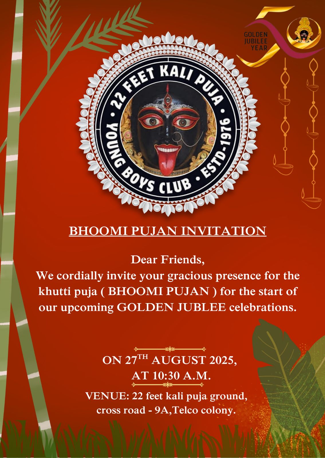 जमशेदपुर : टेल्को कॉलोनी का ऐतिहासिक यंग बॉयज़ क्लब इस वर्ष अपनी प्रतिष्ठित 22 फीट ऊँची माँ काली पूजा का गोल्डन जुबली वर्ष मना रहा है। वर्ष 1976 में स्थापित यह पूजा न केवल कोल्हान क्षेत्र में, बल्कि पूरे झारखंड एवं पड़ोसी राज्यों बंगाल, ओड़िसा और बिहार में भी विशेष पहचान रखती है।