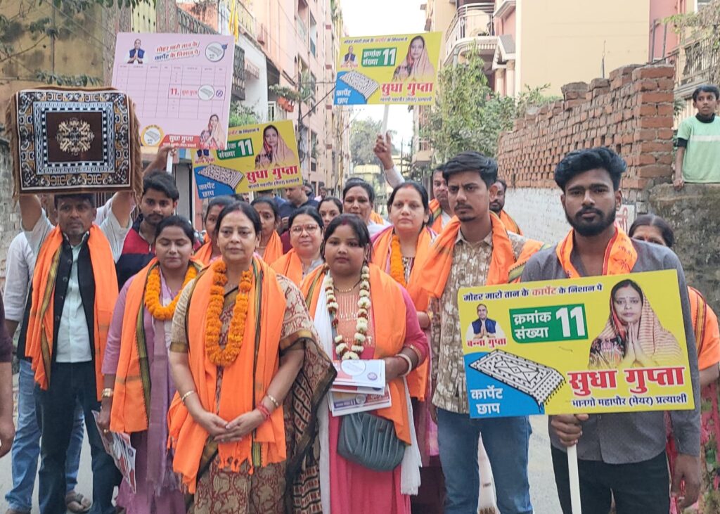 जमशेदपुर : मानगो नगर निगम चुनाव को लेकर चुनावी सरगर्मी तेज हो गई है। झारखंड प्रदेश के पूर्व स्वास्थ्य मंत्री बन्ना गुप्ता ने मानगो मेयर प्रत्याशी सुधा गुप्ता के समर्थन में बागान शाही क्षेत्र में व्यापक पदयात्रा निकाली। इस दौरान क्रॉस रोड नंबर 1, 3, 4, 5, 6, 7 और 9 में डोर-टू-डोर जनसंपर्क कर लोगों से वोट देने की अपील की गई।