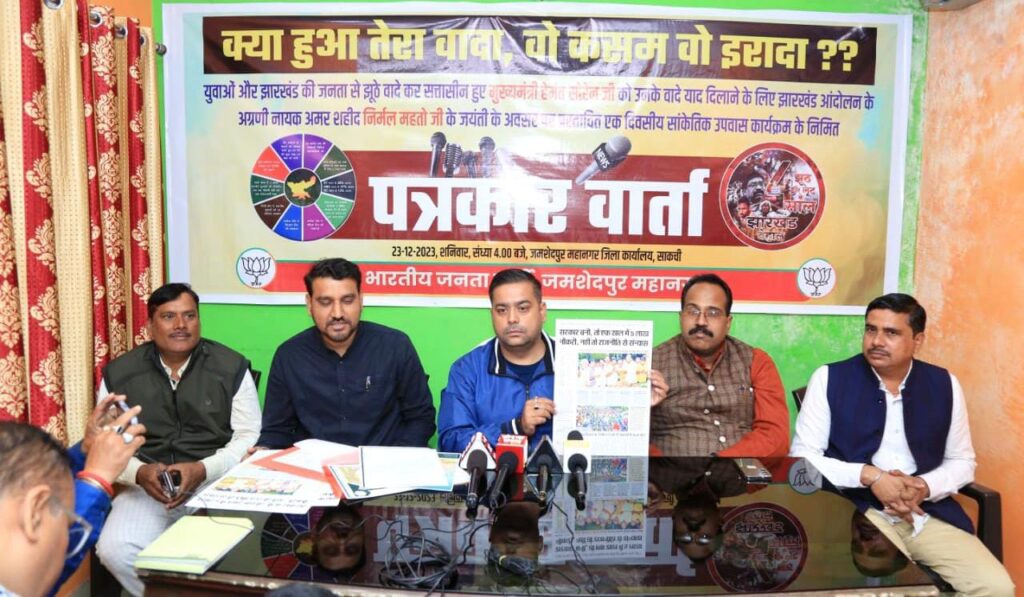 जमशेदपुर। झारखंड राज्य के जनक, पूर्व प्रधानमंत्री एवं भारत रत्न से सम्मानित अटल बिहारी वाजपेयी एवं झारखंड आंदोलन के अग्रणीय नायक, शहीद निर्मल महतो के जयंती के अवसर पर 25 दिसंबर को भाजपा जमशेदपुर महानगर अध्यक्ष गुंजन यादव जमशेदपुर के कदमा उलियान स्थित शहीद निर्मल महतो के समाधि स्थल के समक्ष एकदिवसीय शांतिपूर्ण उपवास पर बैठेंगे। इस दौरान वे मुख्यमंत्री हेमंत सोरेन को 8 अगस्त, 2019 को शहीद आंदोलनकारी निर्मल महतो की शहादत दिवस पर जमशेदपुर में किये गए वादे को स्मरण कराने की कोशिश करेंगे। इस आशय की जानकारी स्वयं भाजपा जमशेदपुर महानगर अध्यक्ष गुंजन यादव ने दी। वे शनिवार को साकची स्थित जिला भाजपा कार्यालय में आयोजित प्रेस वार्ता को संबोधित कर रहे थे। प्रेस- वार्ता में जिला महामंत्री राकेश सिंह, जिला मीडिया प्रभारी प्रेम झा, भाजपा कदमा मंडल अध्यक्ष राजेश सिंह एवं साकची पश्चिम मंडल अध्यक्ष बजरंगी पांडेय भी मौजूद रहे। गुंजन यादव ने बताया कि 4 साल से मुख्यमंत्री के रूप में हेमंत सोरेन की याददाश्त थोड़ी कमजोर हो गयी है। वर्ष 2019 में शहीद निर्मल महतो के शहादत दिवस पर उनके पवित्र समाधि स्थल को साक्षी मानकर प्रदेश के युवाओं से 1 वर्ष में 5 लाख नौकरी देने का वादा किया था। नौकरी ना देने पर राजनीति से सन्यास की घोषणा उन्होंने खुले मंच से की। लेकिन आज सत्ता में आसीन होने के चार साल बीतने के बाद भी इस दिशा में कोई पहल नही की गई। इसी निमित्त, उन्हें वादों को स्मरण कराने हेतु आगामी 25 दिसंबर को एकदिवसीय शांतिपूर्ण सांकेतिक उपवास कार्यक्रम के लिए उन्होंने जिले के अनुमंडल पदाधिकारी को इसकी जानकारी देकर अनुमति हेतु आवेदन जमा किया है। मैं पूछना चाहता हूं कि मुख्यमंत्री जी क्या हुआ तेरा वादा! क्या सिर्फ इसलिए कि आप चुनाव जीत जाएं इसके लिए आपने शहीद निर्मल महतो की शहादत दिवस पर झूठी कसम खा ली। चार साल बीतने के बाद तो यही प्रतीत हो रहा है कि आपने एक शहीद के नाम पर राजनीति कर युवाओं के साथ विश्वासघात किया है। उन्होंने बताया कि रविवार को सुबह 10 बजे जिला भाजपा कार्यालय में सीएम हेमंत सोरेन की सद्बुद्धि एवं तानाशाह सरकार की संवेदनशीलता हेतु समुहिक रूप से पूरे विधि-विधान से यज्ञ-हवन किया जाएगा। उन्होंने कहा कि आज प्रदेश के युवा अपने हक और रोजगार के लिए सड़क पर हैं। लेकिन उन्हें नौकरी देने की बात तो दूर बल्कि उनकी आवाज को गोली-बंदूक, लाठियों और झूठे मुकदमों के दम पर कुचलने की लगातर कोशिश होती है।