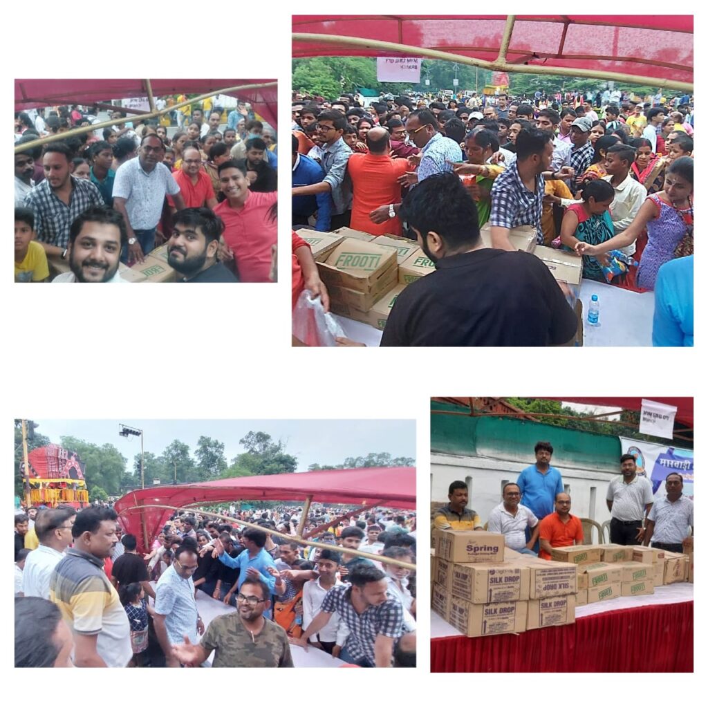 जमशेदपुर: बिस्टुपुर श्री राम मंदिर से साकची की तरफ बढ़ने वाली भगवान जगन्नाथ, माता सुभद्रा और भगवान बलभद्र की रथयात्रा में अपराह्न 3 बजे से जुस्को गोलचक्कर के समीप लगभग 2800 भक्तों के बीच चिप्स, लड्डू, बिस्कुट, जूस, पानी आदि बांटा गया। मारवाडी युवा मंच स्टील सिटी महाप्रभु की रथ यात्रा के उपलक्ष पर हमेशा ही श्रद्धालुओं की सेवा में स्टॉल लगाते आई है। कार्यक्रम में झारखण्ड प्रांत के उपाध्यक्ष एवं पूर्व अध्यक्ष अजय चेतानी, निवर्तमान प्रांतीय महामंत्री सह पूर्व अध्यक्ष कृष्णा अग्रवाल और राजस्थान भवन सोनरी के सचिव सुरेश अग्रवाल मौजूद रहे और भक्तों की सेवा की।