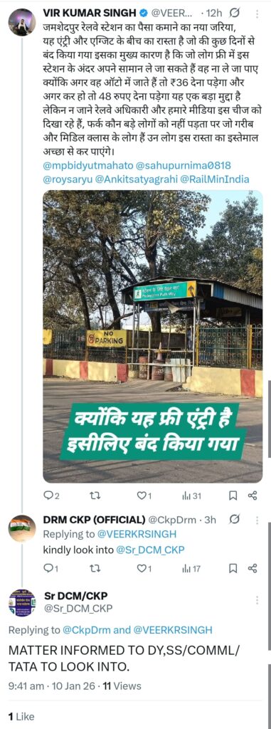 लोकतंत्र सवेरा : भाजपा नेता वीर सिंह ने सोशल मीडिया प्लेटफॉर्म एक्स (पूर्व में ट्विटर) के माध्यम से टाटानगर रेलवे स्टेशन पर पैदल यात्रियों के प्रवेश मार्ग को अवरुद्ध किए जाने का गंभीर मुद्दा उठाया है। उन्होंने चक्रधरपुर मंडल के रेलवे डीआरएम सहित जमशेदपुर के निर्वाचित जनप्रतिनिधियों का ध्यान आकृष्ट कर इस निर्णय पर सवाल खड़े करते हुए विरोध दर्ज कराया।