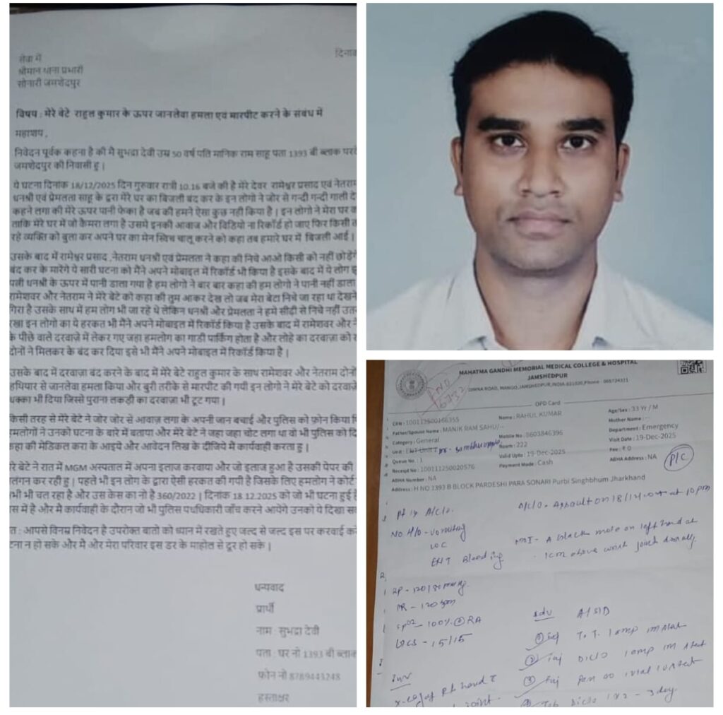 जमशेदपुर : जमशेदपुर से एक सहमा देने वाली घटना सामने आई है, जहाँ एक युवक पर घर में घुसकर जानलेवा हमला किए जाने का गंभीर आरोप लगाया गया है। पीड़ित परिवार का कहना है कि दबंग पड़ोसियों ने साजिश के तहत बिजली काटी, गाली-गलौज की, पानी फेंका और फिर युवक को बेरहमी से पीटा।