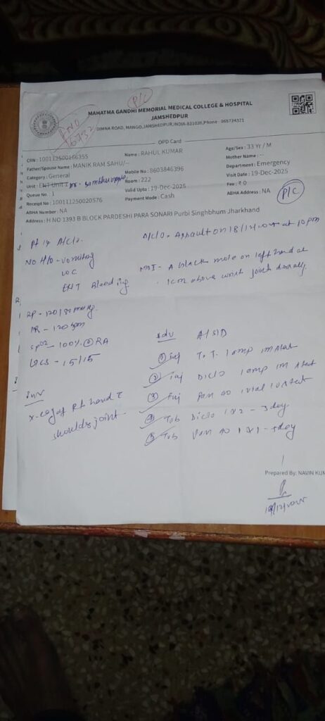 घायल राहुल कुमार का एमजीएम अस्पताल में इलाज कराया गया, जिसकी मेडिकल रिपोर्ट और कागजात शिकायत के साथ संलग्न किए गए हैं।