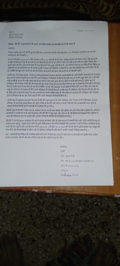 आरोप है कि इसके बाद रामेश्वर प्रसाद, नेतराम साहू, धनसी साहू और प्रेमलता साहू ने घर के बाहर आकर गाली-गलौज शुरू कर दी और जबरन पानी फेंकने लगे। परिवार द्वारा विरोध करने पर हालात और बिगड़ गए।