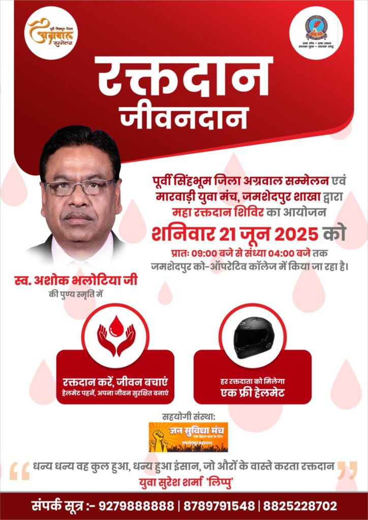 जमशेदपुर : पूर्वी सिंहभूम जिला अग्रवाल सम्मेलन और मारवाड़ी युवा मंच जमशेदपुर शाखा के संयुक्त तत्वावधान में महारक्तदान शिविर का आयोजन किया जा रहा है. यह शिविर 21 जून को जमशेदपुर कोऑपरेटिव कॉलेज में सुबह 9 बजे से शाम के 4 बजे तक आयोजित किया जाएगा। पूर्वी सिंहभूम जिला अग्रवाल सम्मेलन के जिलाध्यक्ष अभिषेक अग्रवाल गोल्डी ने बताया की शिविर का आयोजन सिंहभूम चैम्बर ऑफ कॉमर्स एंड इंडस्ट्री के पूर्व अध्यक्ष समाजसेवी स्वर्गीय अशोक भालोटिया जी की याद में आयोजित किया जा रहा है। उन्होंने कहा की रक्तदान एक महत्वपूर्ण सामाजिक जिम्मेदारी है जो दूसरों की जान बचाने में मदद करती है।