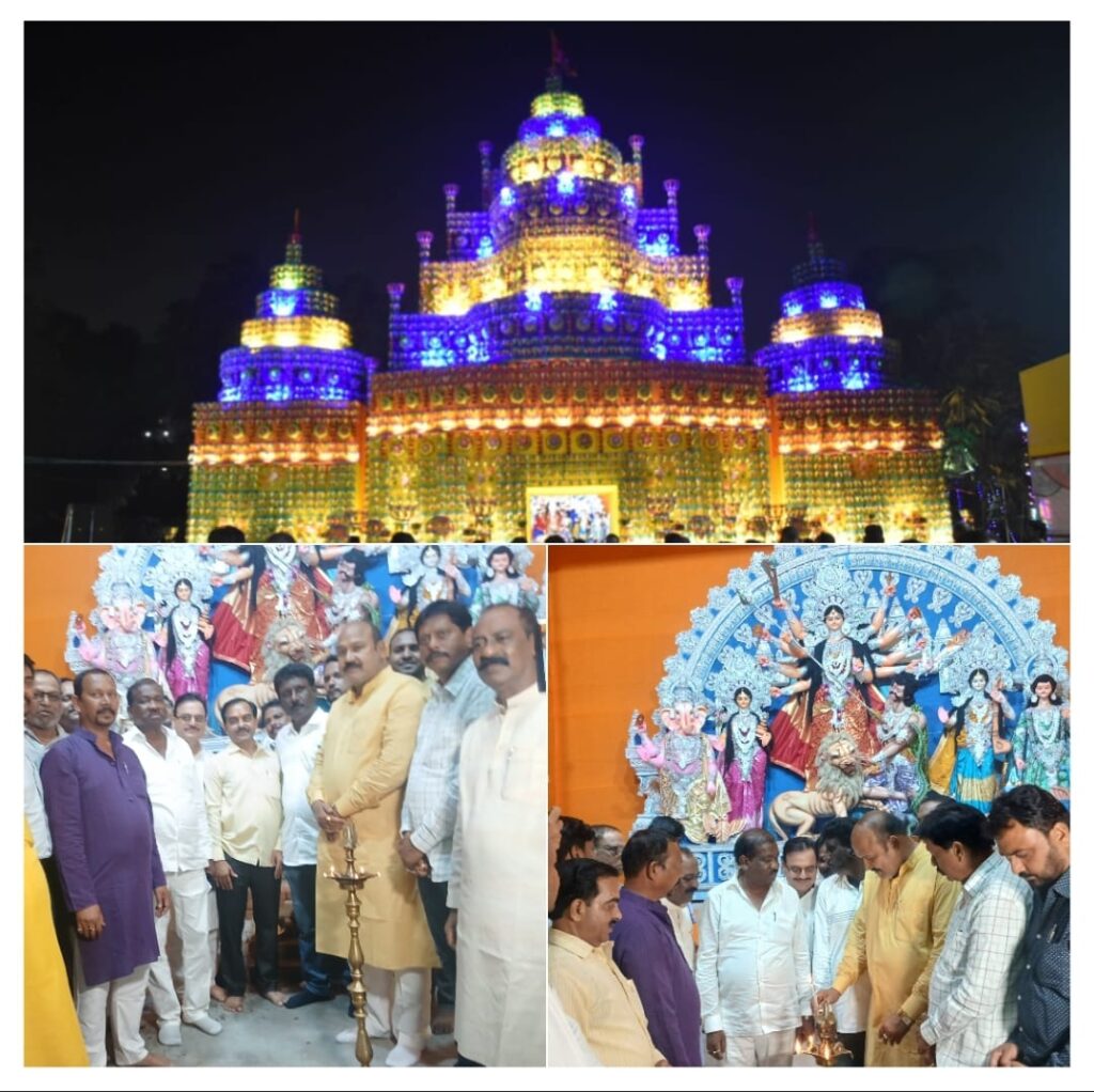 जमशेदपुर : श्री श्री सार्वजनिक दुर्गा पूजा कमिटी टुइलाडूंगरी में इस का महिलाओं के सम्मान में किचन सेट से पंडाल का भव्य रूप दिया गया है. श्री सार्वजनिक दुर्गा पूजा कमेटी टुइलाडुंगरी पूजा पंडाल का उद्घाटन मंत्री रामदास सोरेन व मंत्री दीपक बिरुवा ने संयुक्त रूप से किया. इस पंडाल के निर्माण में लगभग 22 लाख रुपए खर्च हुए हैं. यहां किचन में उपयोग होने वाले स्टील की जाली, प्लास्टिक की जाली, स्टील के डिब्बे, प्लास्टिक के डिब्बे, टब, क्लास, डिनर प्लेट आदि से पूरे पंडाल को सजाया गया है।