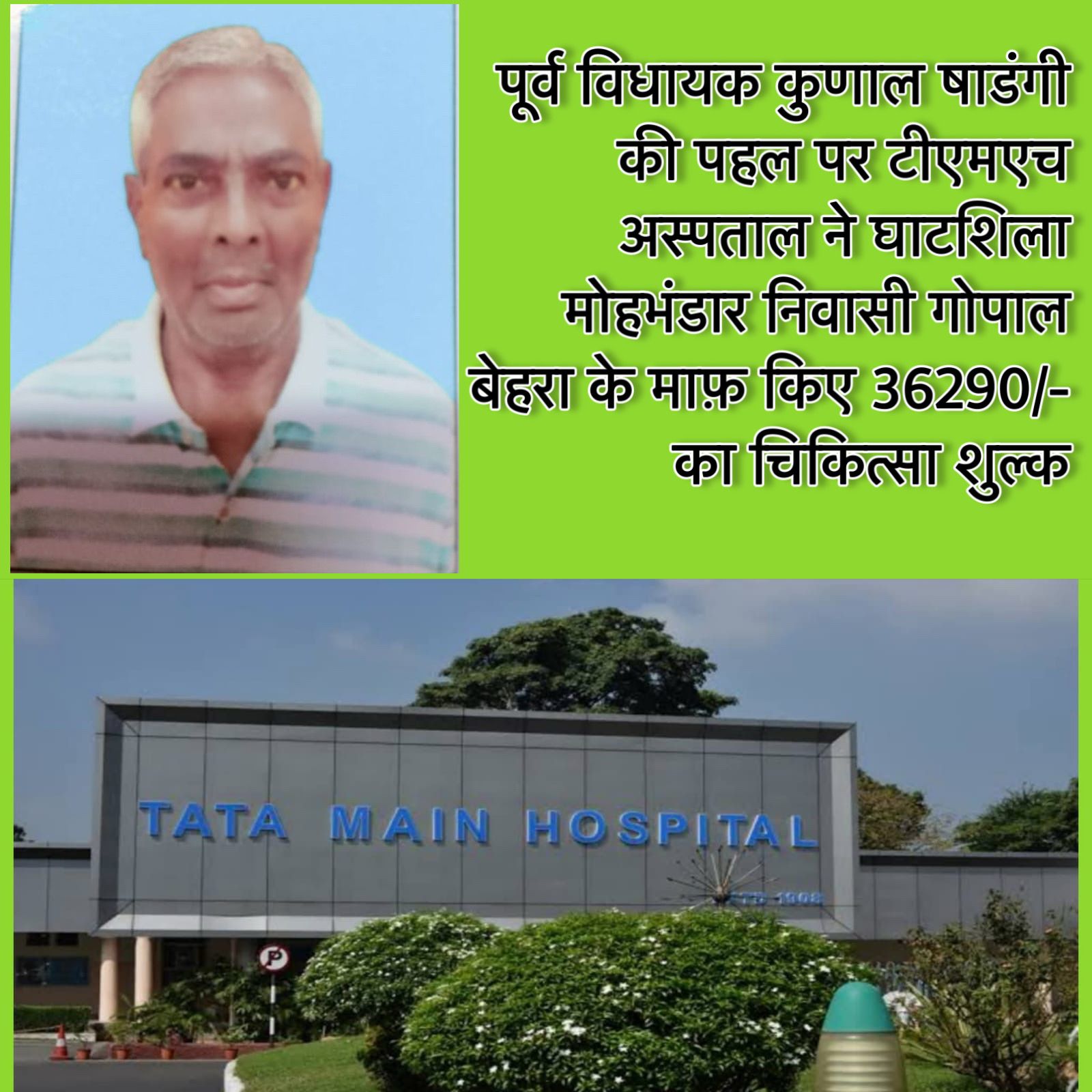 जमशेदपुर : टीएमएच अस्पताल, जमशेदपुर ने घाटशिला के मोहभंडार निवासी गोपाल बेहरा का ₹36,290/- का चिकित्सा शुल्क किया पूर्णतः माफ। गोपाल बेहरा का इलाज टीमएच में चल रहा था, लेकिन आर्थिक तंगी के कारण परिजन शेष बिल चुकाने में असमर्थ थे। इस कठिन परिस्थिति में झामुमो के पूर्व जिला नगर अध्यक्ष दालगोविंद लोहरा जी ने पूर्व विधायक कुणाल षाड़ंगी से संपर्क कर सहयोग का अनुरोध किया।