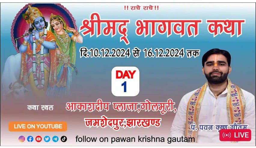 जमशेदपुर : श्री कुसुम मधुबन बिहारी गौ सेवा संस्थान द्वारा भागवत कथा का आयोजन आज से जागर्स पार्क गोलमुरी स्थित मैदान में हो रही है जो निरंतर 17 दिसंबर तक चलेगी. इस भागवत कथा में वृन्दावन से कथावाचक के रूप में पंडित पवन कृष्ण गौतम जी ने सभी को भागवत कथा का रसपान कराया और प्रभु की लीला का वर्णन किया इसके आलावे पंडित ने कहा कि धर्म की रक्षा हेतु आप सदैव तैयार रहे आपसभी अपने अपने धर्म से प्रेम करे गौ रक्षा का संकल्प ले यही भागवत गीता का उद्देश्य है।