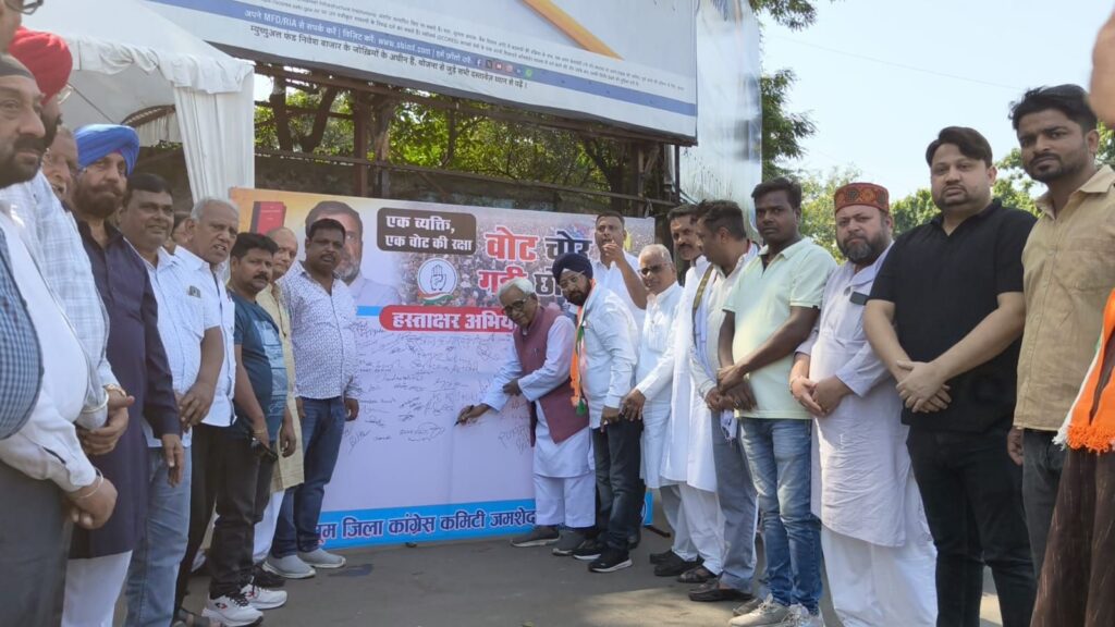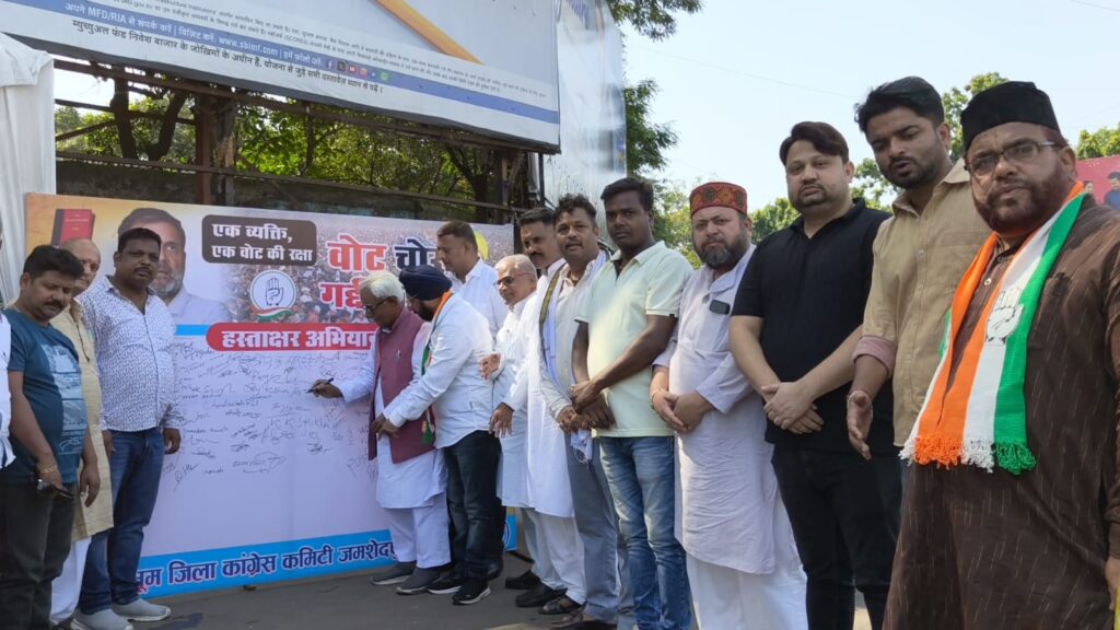 जमशेदपुर : झारखण्ड प्रदेश कांग्रेस कमिटी के निर्देशानुसार साकची प्रखण्ड कांग्रेस कमिटी के अध्यक्ष धर्मा राव के नेतृत्व में साकची गोलचक्कर पर वोट चोर गद्दी छोड कार्यक्रम के तहत हस्ताक्षर अभियान कैम्प लगाकर आम जनता के बीच अभियान चलाया गया। इस अवसर पर मुख्य अतिथि परविंदर सिंह जिला कांग्रेस अध्यक्ष शामिल हुए। हस्ताक्षर अभियान कैम्पेन को चलाते हुए अध्यक्ष परविंदर सिंह ने आम जनता को जागरूक करते हुए कहा कि आज हमारे वोट का अस्तित्व खतरे में पड गया है। मतदाता सूची में एक एक व्यक्ति का नाम कई जगहों पर दर्ज है, पिता का नाम, पता तक नही दर्ज है। लोकतंत्र में वोट देना सभी का हक है। जिसे मिली भगत कर वोटों की ही चोरी की जा रही है। इसका खिलाफ करना सभी नागरिक का धर्म है। वोट चोरी कर जनता के हक को छिना जा रहा है। इसके खिलाफ में हमें एकजुट होना होगा। आज कांग्रेस नेता राहुल गाँधी जी लोकतंत्र को बचाने तथा वोटों की चोरी रोकने के लिए राष्ट्रव्यापी अभियान और आंदोलन चला रहें है।