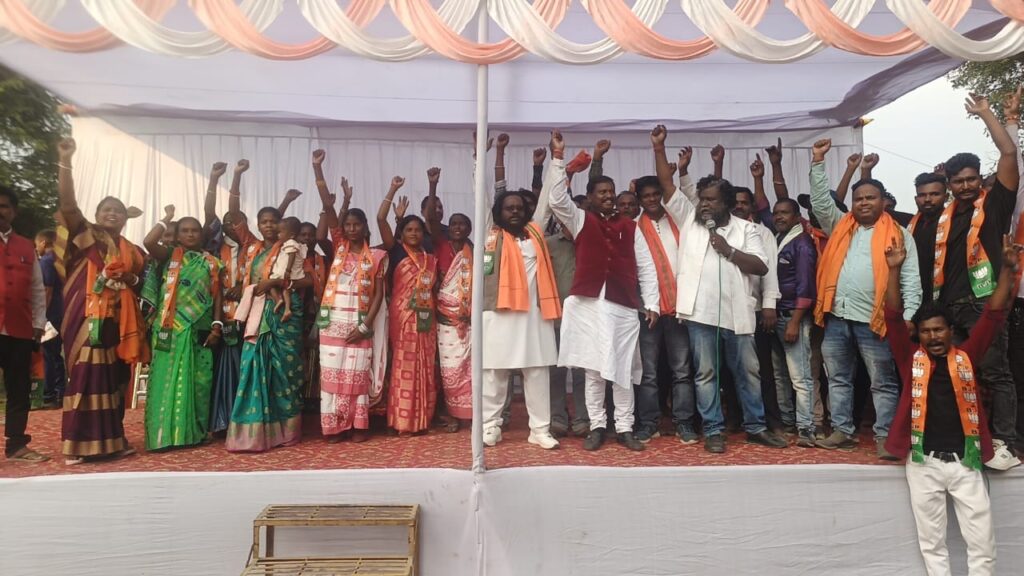 यह दुर्भाग्यपूर्ण है। उन्होंने लोगों से अपील किया कि पोटका को स्वार्थ की राजनीति से मुक्ति हेतु भाजपा को कमल फूल छाप पर वोट देकर चुने। भाजपा प्रत्याशी मीरा मुंडा को आगामी 13 नवंबर को इवीएम में एक नंबर क्रमांक पर बटन दबाकर विजय बनाएं। उन्होंने कहा कि वर्तमान सरकार मंईयां योजना चुनाव से पूर्व शुरू किया है और वृद्ध वृध्दाओं का पेंशन 6 माह से बंद कर दिया है। भाजपा सरकार आने पर महिलाओं को प्रत्येक माह 11 तारीख को 2100 रुपए देगी। इस अवसर पर भीम आर्मी आजाद पार्टी के प्रदेश उपाध्यक्ष तारिणी माझी अपने दर्जनों समर्थकों संग भाजपा में शामिल हुए। अर्जुन मुंडा ने तारिणी माझी को पट्टा पहनाकर पार्टी में शामिल किया।