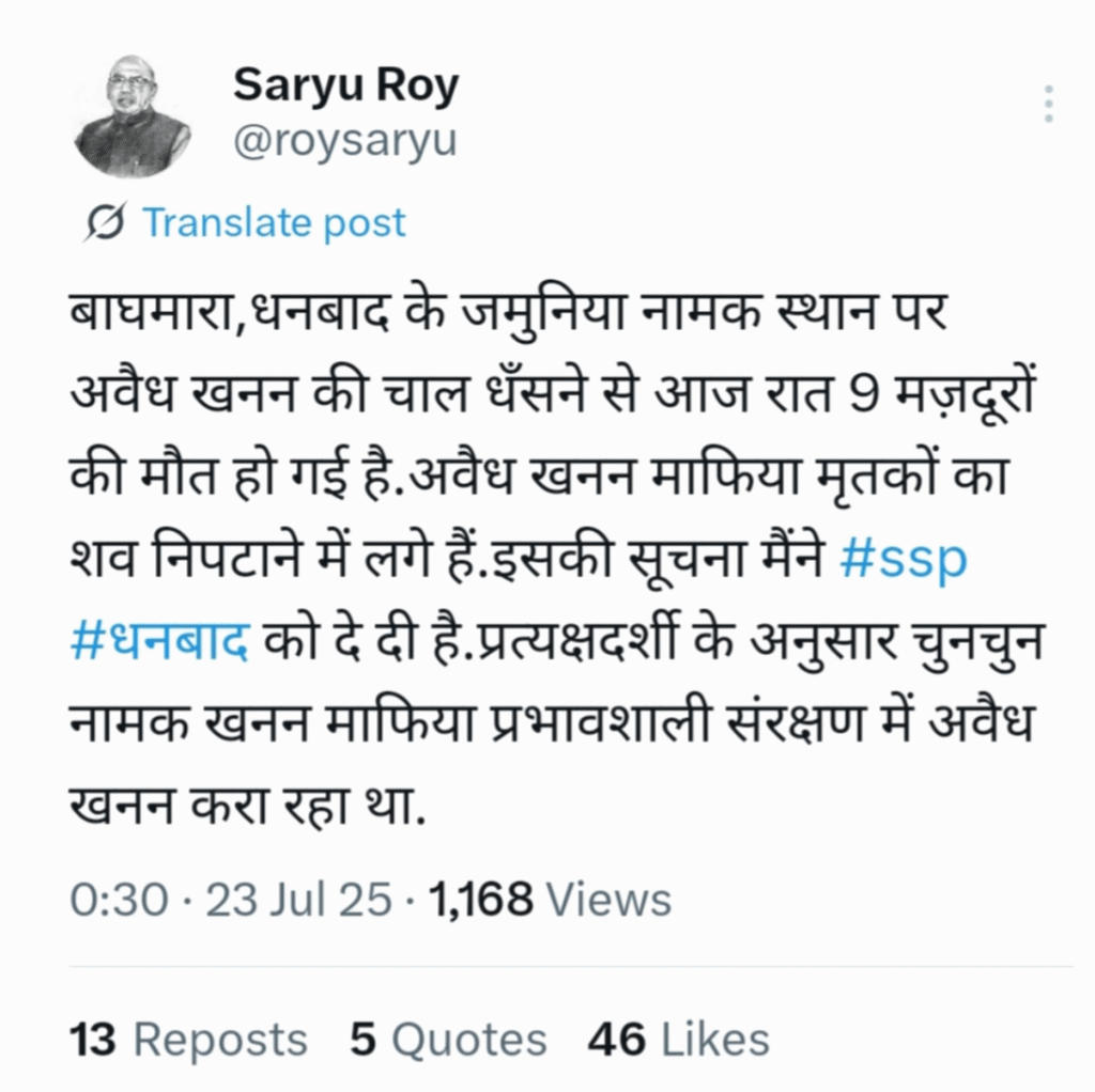 धनबाद : धनबाद के बाघमारा क्षेत्र के जमुनिया में अवैध खनन की बड़ी घटना की खबर आ रही है. बताया जा रहा है कि खनन की चाल धंसने से देर रात 9 मजदूरों की मौत हो गई. प्रत्यक्षदर्शियों के अनुसार, अवैध खनन माफिया शवों को ठिकाने लगाने में जुटे हैं। इस हादसे की जानकारी पूर्व मंत्री और विधायक सरयू राय ने अपने आधिकारिक ट्विटर अकाउंट के माध्यम से दी। उन्होंने ट्वीट में बताया कि उन्होंने घटना की सूचना धनबाद के एसएसपी को दे दी है। सरयू राय ने आरोप लगाया कि चुनचुन नामक खनन माफिया प्रभावशाली लोगों के संरक्षण में अवैध खनन करवा रहा था. यह घटना न सिर्फ अवैध खनन के गहरे नेटवर्क को उजागर करती है बल्कि मजदूरों की सुरक्षा पर भी गंभीर सवाल खड़े करती है। फिलहाल पुलिस और प्रशासनिक कार्रवाई का इंतजार है।