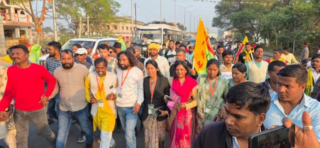 बोकारो : झारखंड लोकतांत्रिक क्रांतिकारी मोर्चा द्वारा खतियान व छात्रों की मांगो को लेकर आज से आंदोलन शुरू कर दिया है। ‘छात्र अधिकार यात्रा’ को विधायक जयराम कुमार महतो ने डुमरी (बोकारो) से रवाना किया। यह पदयात्रा 09 दिसंबर को रांची पहुंचकर विधानसभा के समक्ष प्रदर्शन करेंगें। संगठ केंद्रीय अध्यक्ष जयराम कुमार महतो द्वारा चिरैया मोड़ में विनोद बिहारी महतो जी के प्रतिमा माल्यार्पण के साथ पदयात्रा को आरंभ किया। एवं पदयात्रा को सुरक्षित सुचारू सफल बनाने हेतु आवश्यक हिदायत भी दिया। एवं सर्वदलिय बैठक में शामिल होने हेतु राजधानी रांची को रवाना हुए।