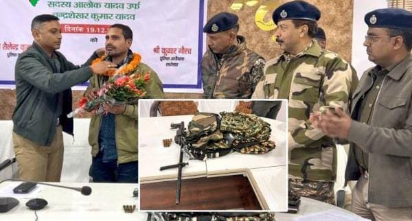 लातेहार : PLFI के एक सक्रय उग्रवादी आलोक यादव उर्फ चन्द्रशेखर कुमार यादव ने शुक्रवार को सरेंडर कर दिया। उसने लातेहार एसपी कुमार गौरव के दफ्तर में हथियार, गोली और वर्दी के साथ आत्मसमर्पण किया। आत्मसमर्पण के दौरान आलोक यादव ने पुलिस के सामने एक देशी बंदूक, चार जिंदा गोलियां और उग्रवादी संगठन की वर्दी सौंपी। वर्दी में कैमोफ्लाज रंग की शर्ट, पैंट, टी-शर्ट और टोपी शामिल हैं। उसके सरेंडर करने के दरम्यान मौके पर पलामू प्रक्षेत्र के आईजी शैलेंद्र कुमार सिन्हा, लातेहार एसपी कुमार गौरव, एसएसबी 32 बटालियन और सीआरपीएफ 11 बटालियन के कमांडेंट सहित सुरक्षा बलों के वरिष्ठ अधिकारी मौजूद रहे।