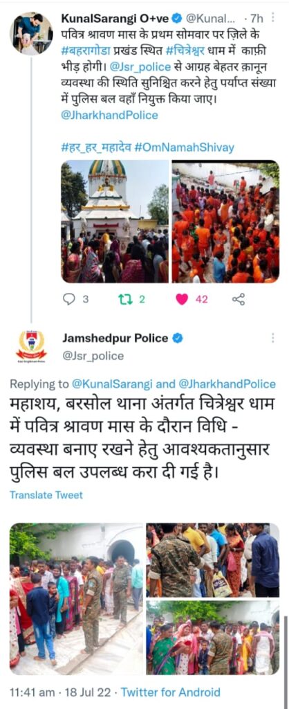 बहरागोड़ा : सावन की पहली सोमवारी पर भारी भीड़ उमडने की आशंका को देखते हुए सोमवार की सुबह में बहरागोडा विधानसभा क्षेत्र के पूर्व विधायक कुणाल षाडंगी ने झारखंड पुलिस और पूर्वी सिंहभूम पुलिस से आग्रह किया कि मंदिर की विधि व्यवस्था को बेहतर बनाए रखने के लिए वहाँ अतिरिक्त पुलिस बल की आवश्यकता है। आने वाले दिनों में ये भीड़ और बढ़ेगी। पूर्व विधायक कुणाल षाडंगी के ट्वीट पर संज्ञान लेते हुए पूर्वी सिंहभूम जमशेदपुर पुलिस ने कार्यवाही की और कुणाल षाडंगी को सूचित किया कि आवश्यकतानुसार पुलिस बल नियुक्त कर दिया गया है और उससे जुड़ी तस्वीरें भी साझा की। कुणाल ने जमशेदपुर पुलिस का आभार जताया है।
