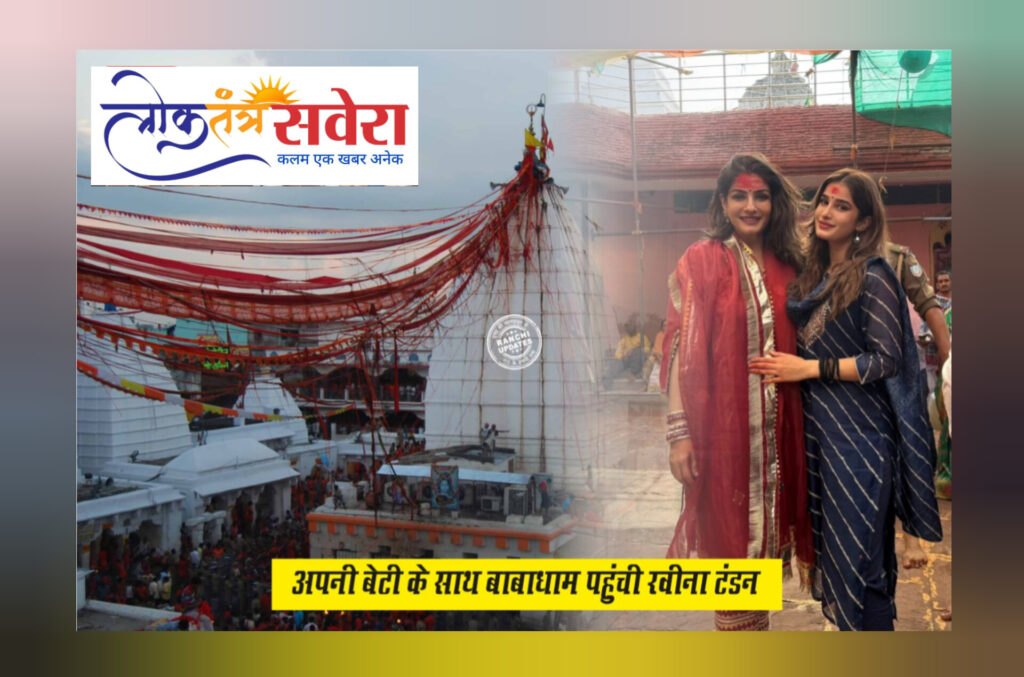 देवघर : बॉलीवुड एक्ट्रेस रवीना टंडन शनिवार को अपनी बेटी राशा के साथ बैद्यनाथ धाम, देवघर पहुंची। मंदिर के प्रबंधक रमेश परिहस्त ने उन्हें और उनकी बेटी को भगवान भोलेनाथ की विधिपूर्वक पूजा करवाई। जैसे ही रवीना मंदिर परिसर में पहुंची, उनके फैंस में उनके साथ सेल्फी लेने के लिए भीड़ लग गयी। पूजा समाप्त होते ही रवीना अपनी बेटी के साथ मंदिर से बाहर निकल गईं। खबर है कि राशा थंदानी की पहली फिल्म जल्द ही रिलीज होने वाली है, जिसमें उनके साथ अभिनेता अजय देवगन का भांजा भी दिखाई देगा। रवीना अपनी बेटी के साथ फिल्म की सफलता की कामना करते हुए बाबा से आशीर्वाद लेने देवघर आई हैं।