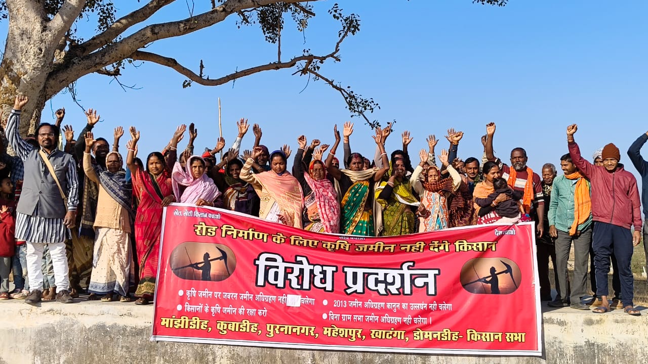 बुंडू : बंता रोड चौड़ीकरण के नाम पर माझीडीह,कुबाडीह, पुरानानगर, महेशपुर,खाटंगा,डोमनडीह गांव के कृषि जमीन पर नये रोड निर्माण की कोशिश के खिलाफ प्रभावित किसानों ने शिवटंगरा मैदान में विरोध प्रदर्शन कर कृषि जमीन नहीं देने का लिया शपथ। कृषि जमीन हमारा जान है,जान देंगे- जमीन नहीं देंगे, जमीन अधिग्रहण कानून 2013 का उल्लघंन नहीं चलेगा, चौड़ीकरण के नाम पर कृषि जमीन पर नये रोड का निर्माण नहीं चलेगा, सरकार कृषि जमीन की रक्षा करे ,बिना ग्राम सभा जमीन अधिग्रहण नहीं चलेगा आदि नारे लग रहे थे। मुख्य वक्ता के रूप में संबोधित करते हुए झारखंड राज्य किसान सभा के राज्य अध्यक्ष सुफल महतो ने कहा बुंडू – बंता रोड चौड़ीकरण के नाम पर माझीडीह, कुबाडीह, पुरानानगर, महेशपुर, खाटंगा, डोमनडीह, गांव के किसानों के कृषि जमीन पर नये रोड निर्माण की कोशिश के खिलाफ किसानों ने झारखंड के मुख्यमंत्री हेमंत सोरेन, एवं उपायुक्त रांची को किसानों ने ज्ञापन सौंपकर कृषि जमीन पर नये रोड निर्माण के लिए जमीन नहीं देने तथा कृषि जमीन की रक्षा का गुहार लगा चुके हैं,80 प्रतिशत किसानों की सहमति का खुल्लम खुल्ला उलंघन हो रहा है। छोटे छोटे जमीन