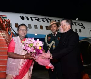 रांची : राष्ट्रपति द्रौपदी मुर्मू के आगमन पर प्रशासनिक अधिकारी और जनप्रतिनिधि मौजूद वायुसेना के विशेष विमान से राष्ट्रपति द्रौपदी मुर्मू रांची पहुंच गई हैं। बिरसा मुंडा एयरपोर्ट पर शाम 5:50 बजे उनका विमान लैंड हुआ, जहां एयरपोर्ट पर झारखंड के राज्यपाल संतोष गंगवार और मुख्यमंत्री हेमंत सोरेन ने उनका गर्मजोशी से स्वागत किया। राष्ट्रपति तीन दिवसीय दौरे पर झारखंड आई हैं और अपना दौरा समाप्त करने के बाद 30 दिसंबर को पुनः दिल्ली के लिए प्रस्थान करेंगी।